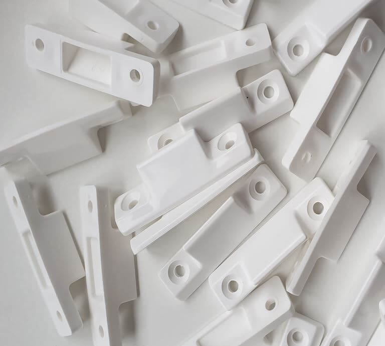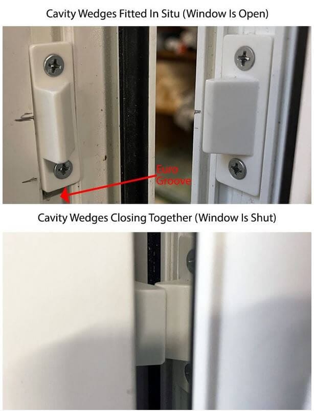 This cavity closing wedges are purpose made to provide both the correct closing position of the hinge side of the push out casement window, and will also in some cases where the window opener is not closing tightly onto the weather sealing gasket also enable it to do so. The wedges are shaped so that as the 2 opposing parts close together they tighten both the vent sash to the upvc outer frame.